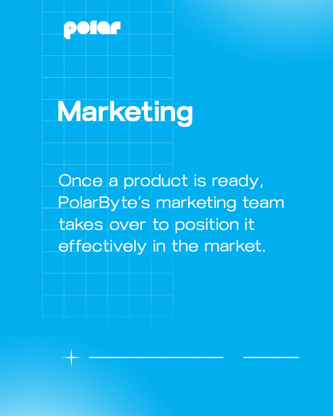 When products are ready, PolarByte’s marketing team ensures effective positioning. Strategies start with market analysis, targeting audiences and highlighting unique selling points. We create engaging narratives, leveraging social media, content, email, and SEO to maximize impact. Campaign performance is tracked and adjusted based on feedback, ensuring the product resonates and achieves its goals.